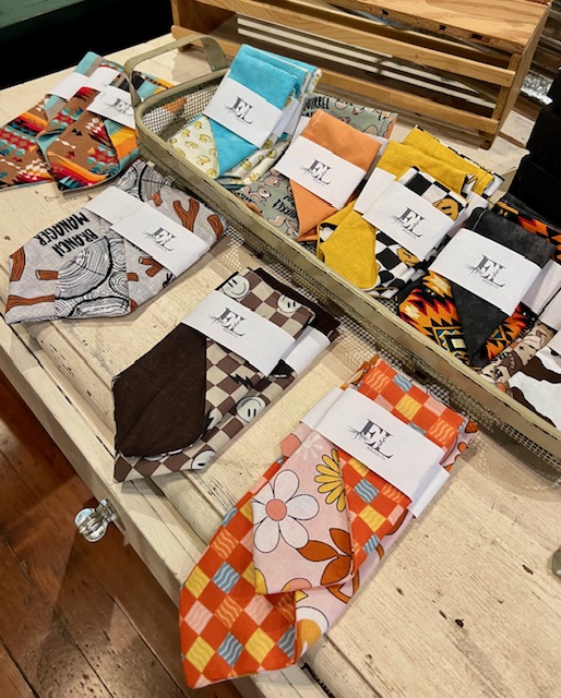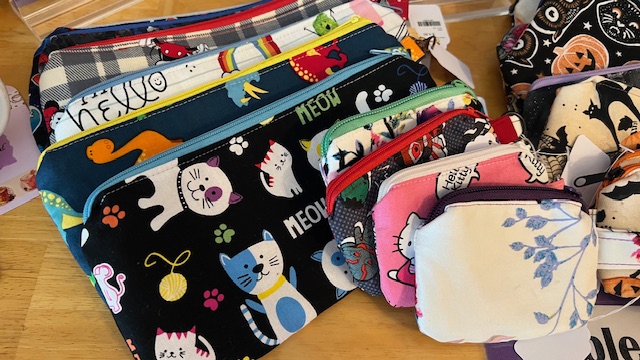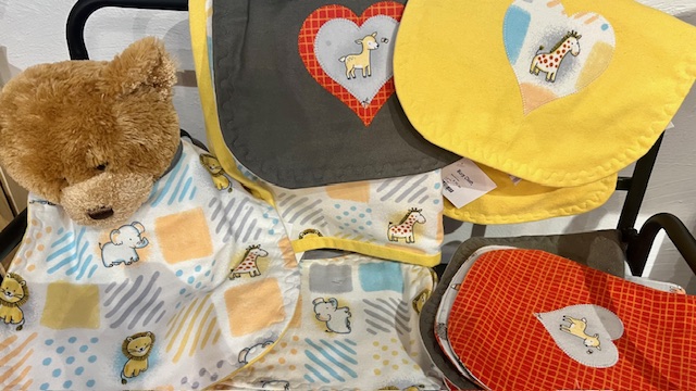 Baby bibs and spit cloths, as well as, table runners, bags and hot pads.